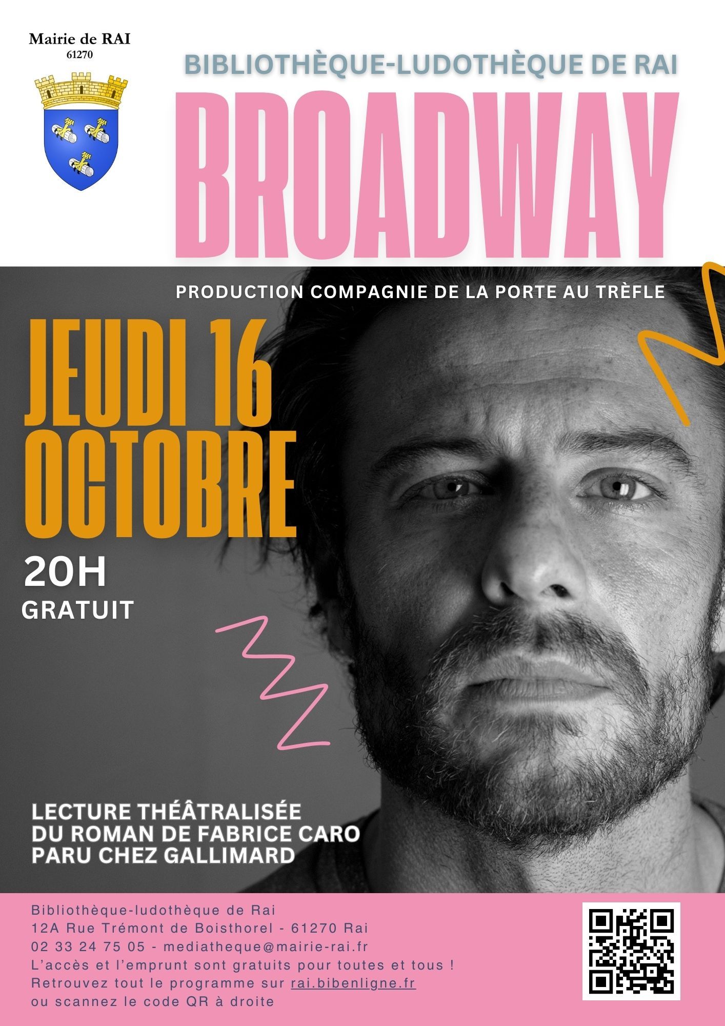 La bibliothèque-ludothèque de Rai accueille la Compagnie de la Porte au Trèfle pour une lecture théâtralisée du roman Broadway de Fabrice Caro.