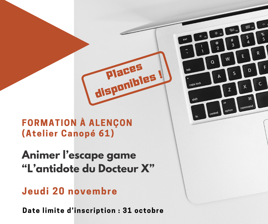 Il reste des places pour la formation Animer l'escape game "L'antidote du docteur X" qui aura lieu à l'atelier Canopé (Alençon) le 20 novembre 2025.