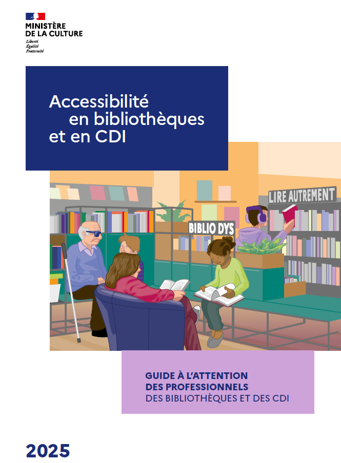 Le Ministère de la Culture a publié sur son site un guide "Accessibilité en bibliothèques et en CDI", à l’attention des professionnels des bibliothèques et des Centres de Documentation et d'Information (CDI).